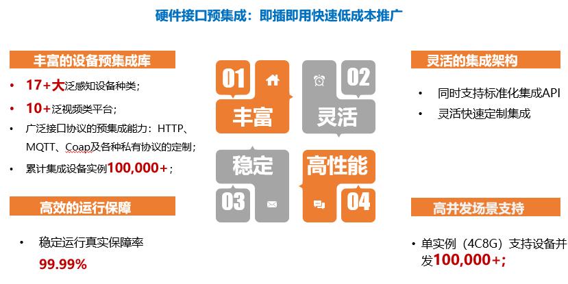 迄今东升国际官网公司已经预集成17+大泛感知设备种类,10+泛视频类平台,广泛接口协议的预集成能力涵盖了HTTP、MQTT、Coap及各种私有协议的定制,累计集成设备实例达100,000+。它还支持标准化集成API,可灵活快速地定制集成,通过构建规则引擎,实现了各设备间的联动应用,比如检测到违规停车,联动广播就会自动播报提醒,为社区管理服务赋能。